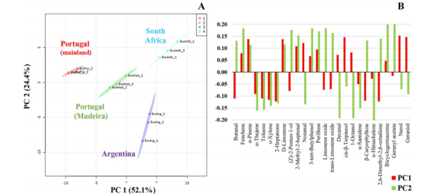 從圖中可以看到,PCA的第一個(gè)主成分(PC1)總方差為52.1%,可以將檸檬生長在葡萄牙大陸和馬德拉的品種進(jìn)行區(qū)分,(乙醇、乙酯,辛酸、反式-βα,紫蘇醛和揮發(fā)性有機(jī)物揮發(fā)性有機(jī)物)。第二主成分(PC2)占模型總方差的24.4 %,并將南非生產(chǎn)的品種與阿根廷生產(chǎn)的品種(α-pinene、 α-thujene、甲苯、甲苯、1-丁醇、d-檸檬烯和2-甲基-2-庚烯)分開。